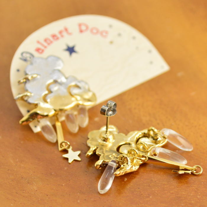 ・ブランド :Palnart Poc パルナートポック ・商品名 :遠雷 ピアス ・素材 :ピューター カットガラス ・サイズ :縦約40mm×横約25mm ・ポスト :サージカルステンレス ・特徴 :遠くの空で雷雲がゴロゴロと音を立てているデザインのアクセサリー雷の光が反射して雲の下の方は金色に染まっているようですビーズの形状は個体差があります ★