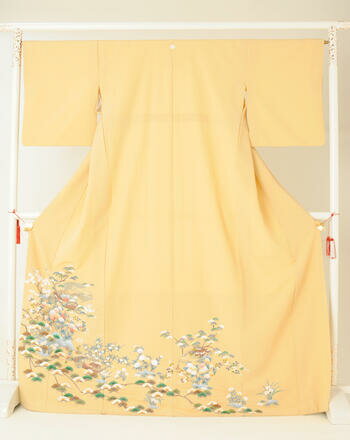 色留袖レンタル フルセット「イエロー波流水に松菊扇花々」ht032 全て揃う安心 色留袖レンタルフルセット!! しあわせ創庫の色留袖は小物もすべて揃っています。