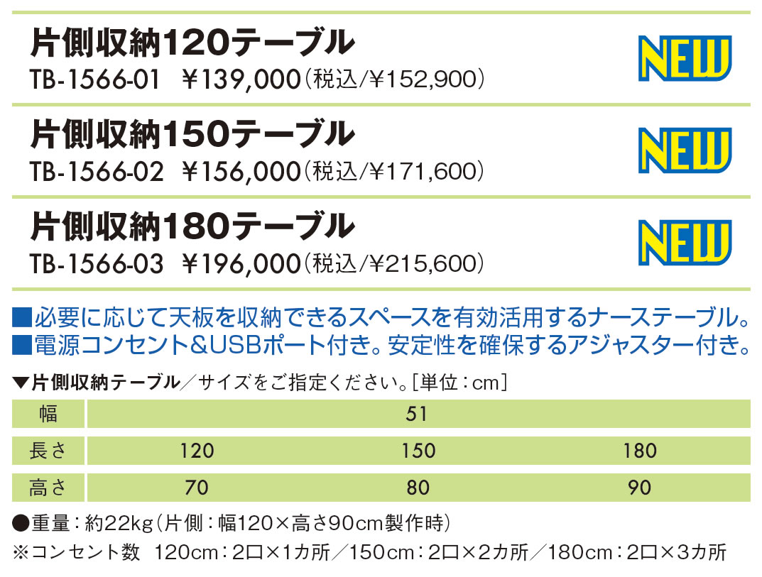 TB-1566-03 片側収納180テーブル 必要に応じて天板を収納できるスペースを有効活用するナーステーブル。