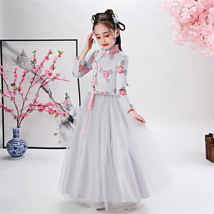 グレー 刺繍トップス+スカート ワンピース 子供服 女の子 唐装漢服 キッズ ドレス 舞台演出団体服 中国古代美人服 中華風 長袖 ロング丈ワンピース ロングワンピース チャイナドレス イベント学園祭文化祭写真撮影 110-160CM コスチューム コスプレ