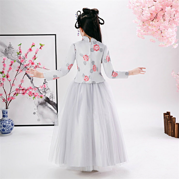 グレー 刺繍トップス+スカート ワンピース 子供服 女の子 唐装漢服 キッズ ドレス 舞台演出団体服 中国古代美人服 中華風 長袖 ロング丈ワンピース ロングワンピース チャイナドレス イベント学園祭文化祭写真撮影 110-160CM コスチューム コスプレ