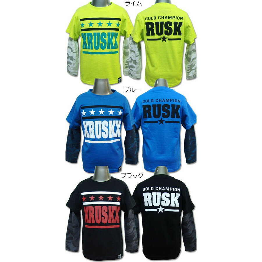 【ブランド:RUSK】 【キッズ Tシャツ】 重ね着風のロンT!この1枚でおしゃれに決まります! 【サイズ:100/110/120/130/140/150/160】 ・100⇒着丈:約42cm/身幅:30cm/裄丈:34cm ・110⇒着丈:約45cm/身幅:32cm/裄丈:38.5cm ・120⇒着丈:約48cm/身幅:34cm/裄丈:42cm ・130⇒着丈:約51cm/身幅:36cm/裄丈:46cm ・140⇒着丈:約54cm/身幅:38cm/裄丈:50cm ・150⇒着丈:約57cm/身幅:40cm/裄丈:54cm ・160⇒着丈:約60cm/身幅:42cm/裄丈:58cm 【カラー:ライム/ブルー/ブラック】 【素材:本体/ポリエステル65% 綿35%】 ※注意事項※ 採寸は平置きでの計測です。