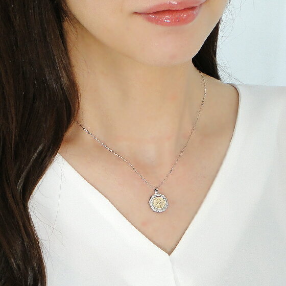 18金とプラチナのコンビカラーコインを、0.28カラットのダイヤモンドで取り巻き、ワンランク上のコインネックレスに仕上げました。