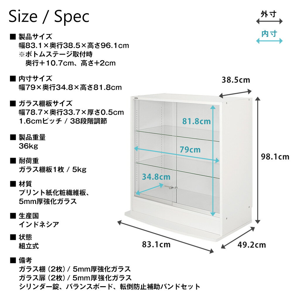 コチラはLED照明無しタイプですが、サイドにLED取り付け用のレールが仕込まれていますので、後でLEDユニットを追加する事も可能です 汎用サイズの29cm奥行と深型サイズの39cm奥行の2サイズがありますので、コレクションサイズに合わせたオリジナルディスプレイに仕上げる事ができます オプションで背面ミラーを取り付け可能ですので、更にご自慢のコレクションを美しく飾る事が可能 標準で鍵付きガラス扉が付きますので、地震等でコレクションが落下するのを防ぎ、お子さん等のイタズラも防止します ハイタイプにはオプションで耐震上置も設置できますので、東京直下型地震・東海地震等が気になる地域にお住まいの方には是非追加設置をご検討下さい ■商品詳細■ サイズ 幅 奥行 高さ 83.5cm 39cm 96cm 転倒防止用ボトムステージ取り付け時は 幅83.5cm・奥行49cm・高さ98cmとなります 棚耐加重 1段:約5kg 製品仕様 シリンダー錠×1セット ガラス棚×2枚 転倒防止バンド付属 お客様組み立て商品となります このセットはLED照明別売りです 製品材質 本体:MDF(繊維材) プリント化粧板 生産国 本体:インドネシア製 ←全体寸法はコチラ 注:このセットはLED照明別売りです 注:ご希望のカラーをご選択下さい 注:お客様組立商品です 注:壁際でのご使用が主体の為、背面化粧は未処理です 注:転倒防止上置きは別売りオプションとなります 注:背面ミラーは別売りオプションとなります 注:単体設置の場合は必ず付属のボトムステージをお取り付け下さい 注:2022年サイズ追加Verです メーカー希望小売価格はメーカーカタログに基づいて掲載しています 転倒防止上置・背面ミラーは別売りオプションとなります 追加ガラス棚も1枚からオプションにて販売中です 上記専用オプションページより、御必要に合わせて別途ご購入下さい 各種オプションはワイドタイプのものと兼用となります ■専用オプション背面ミラー■ ■39cm奥行用 追加ガラス棚■ ■39cm奥行用 転倒防止上置■ オプションとの組み合わせご購入ならセット割がオトク! サイズや組み合わせに合わせて色々選べます♪