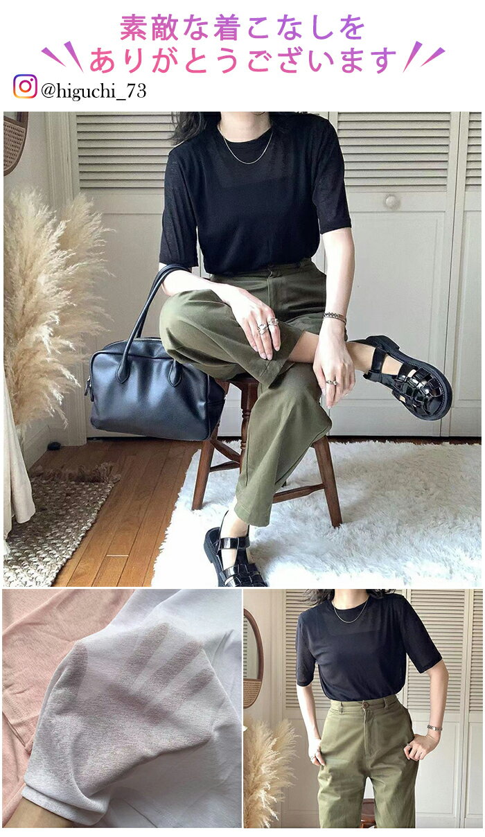 ジャケットや、シャツ、ニットなどにレイヤードや、 春夏はインナーに見せブラや同色のキャミソールで一枚でのスタイル、 ニットベストやビスチェ、キャミワンピとレイヤードスタイルにも オールシーズン着まわせる万能トップス◎ 半袖タイプは夏にタンクトップの上に重ねてレイヤードすることで、 ほんのり透け感を演出し、Tシャツより女性らしく、 でも抜け感のある、大人なカジュアルスタイルが完成します。