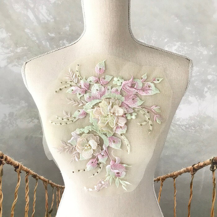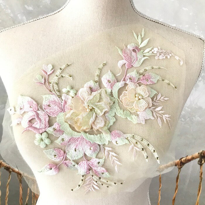 花柄のとてもエレガントなパールとストーン付きの 刺繍チュールモチーフです。